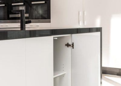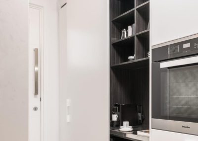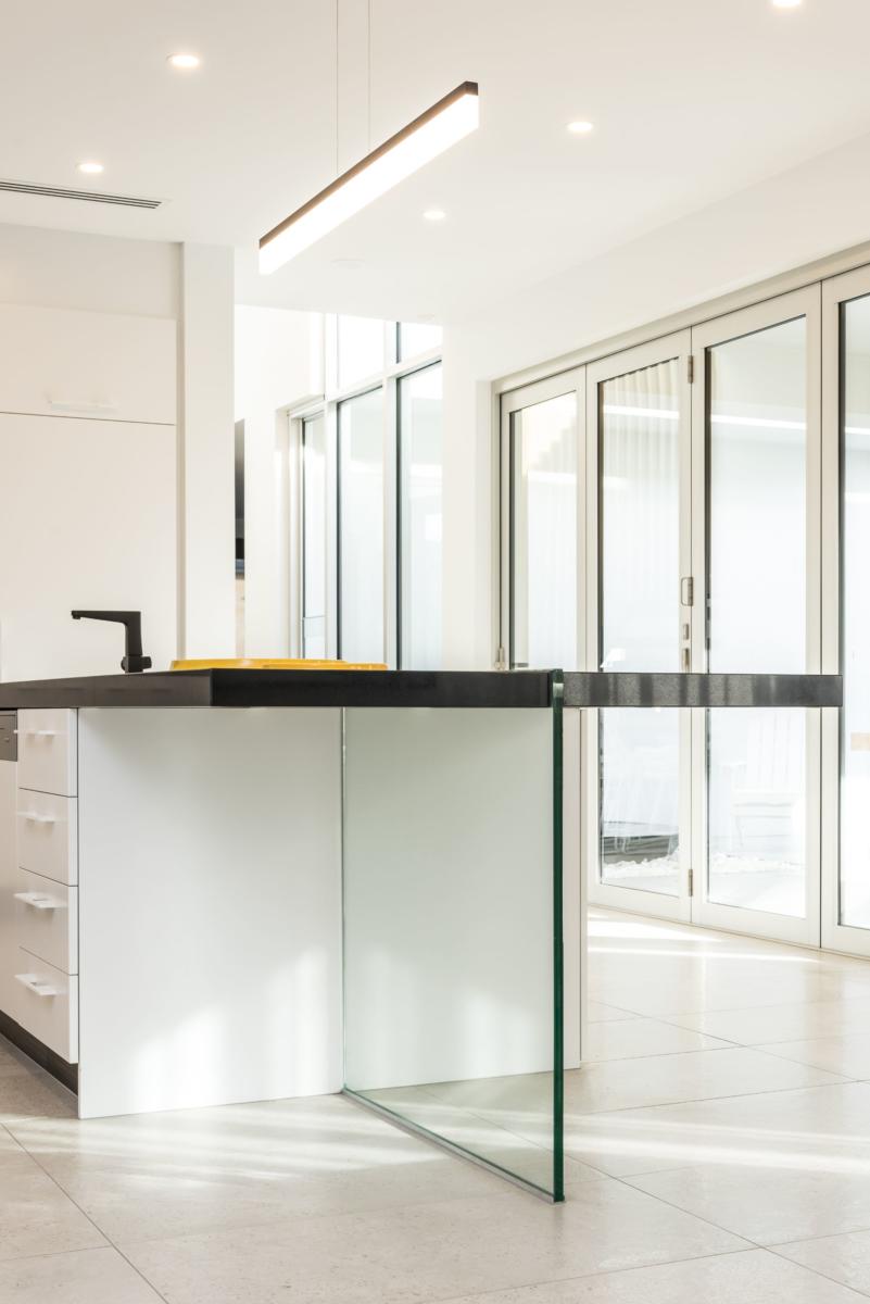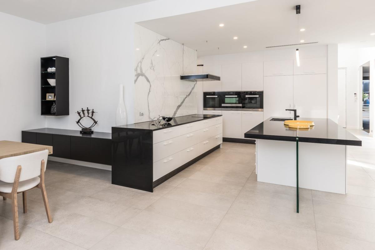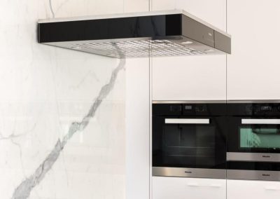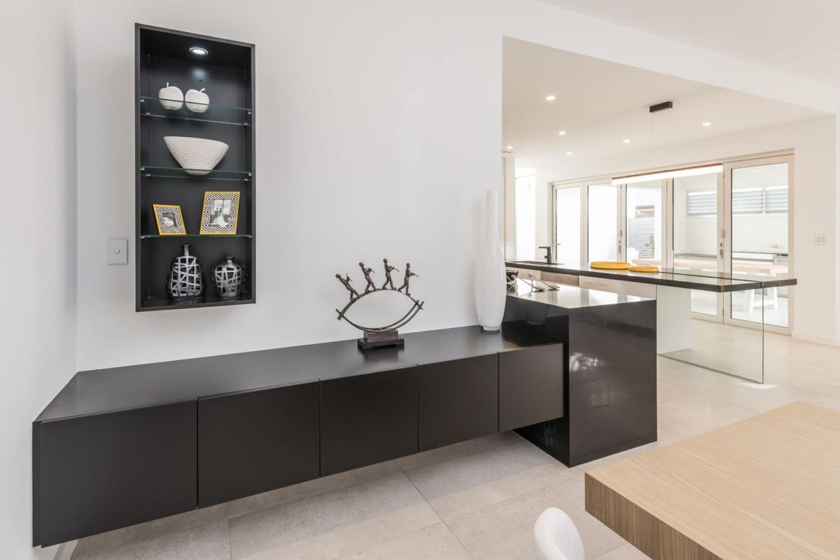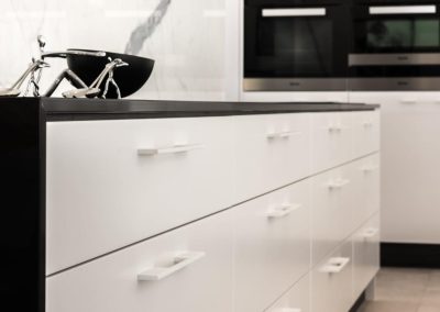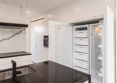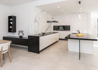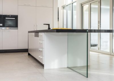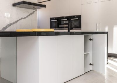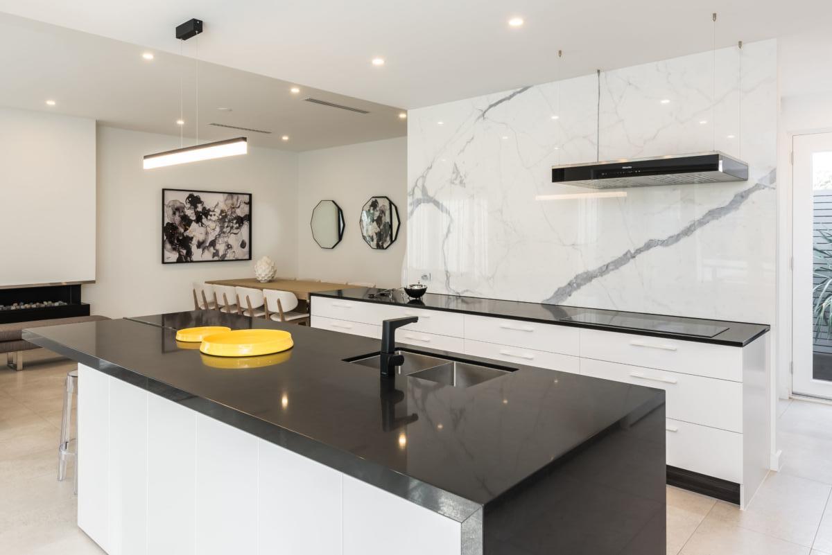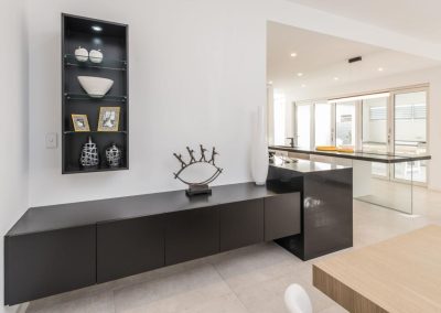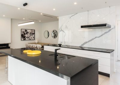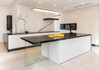This stunning entertainer’s kitchen oozes style – the monochrome colour palette and marble and glass features perfectly complement the stone benchtop in jet black and two-pack satin finish. Designed with functionality in mind.