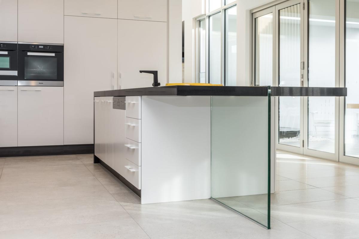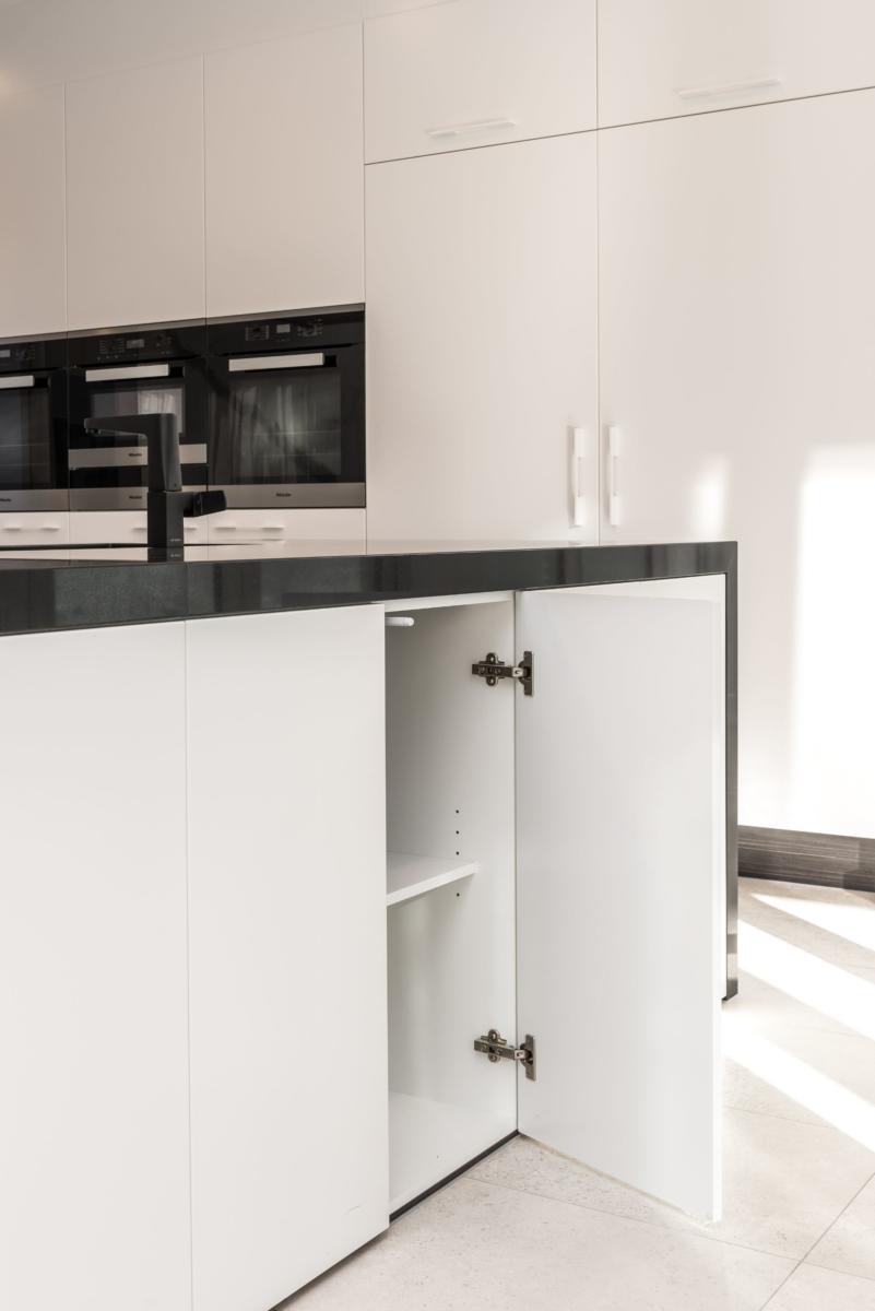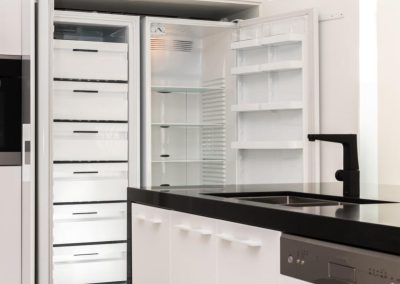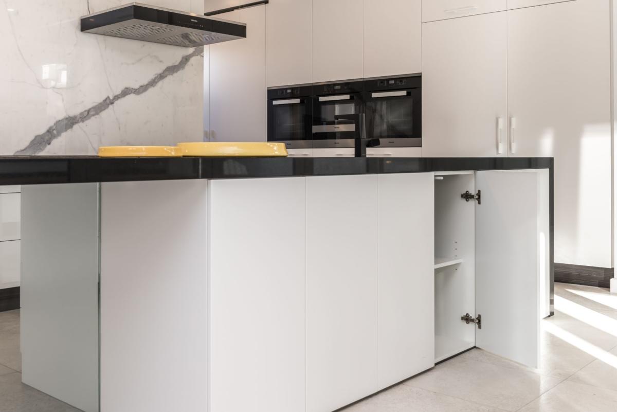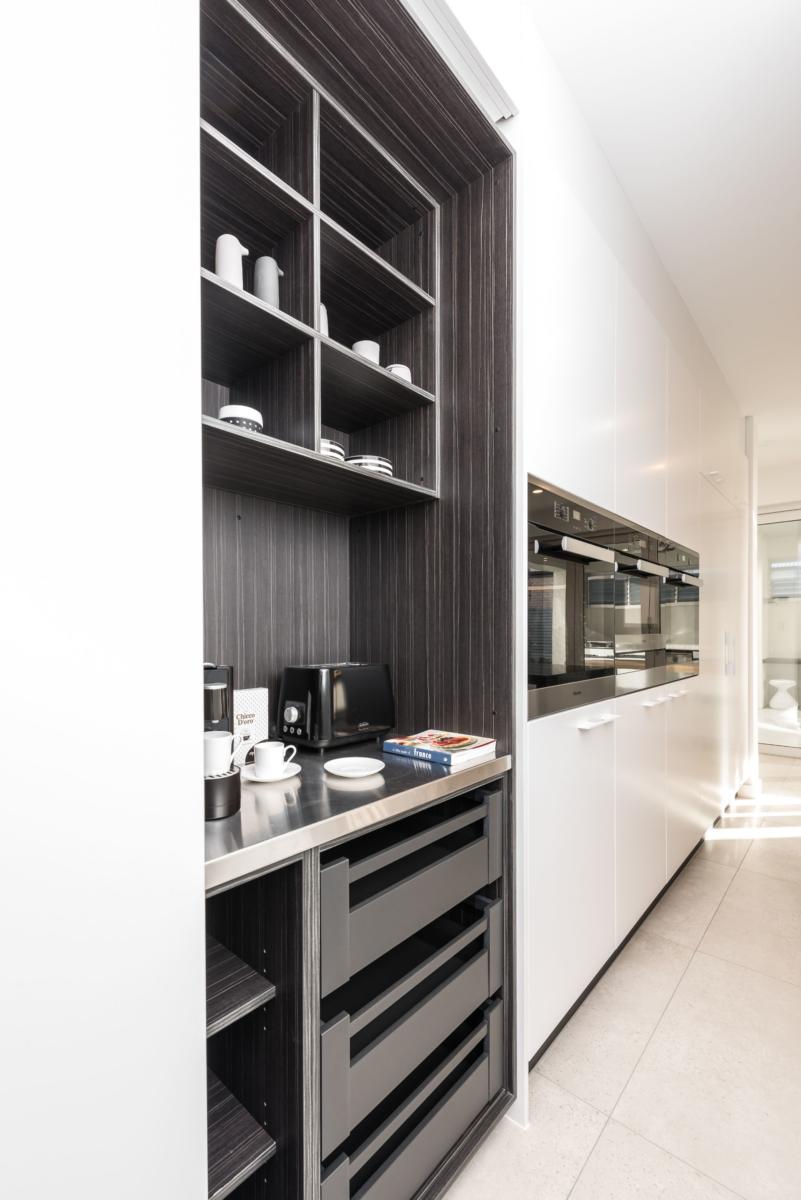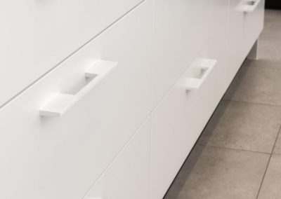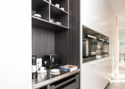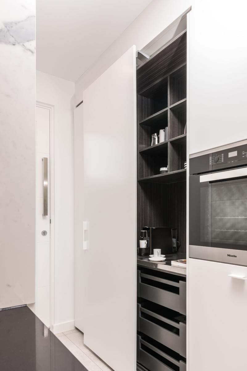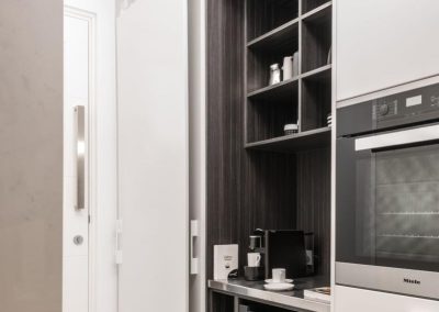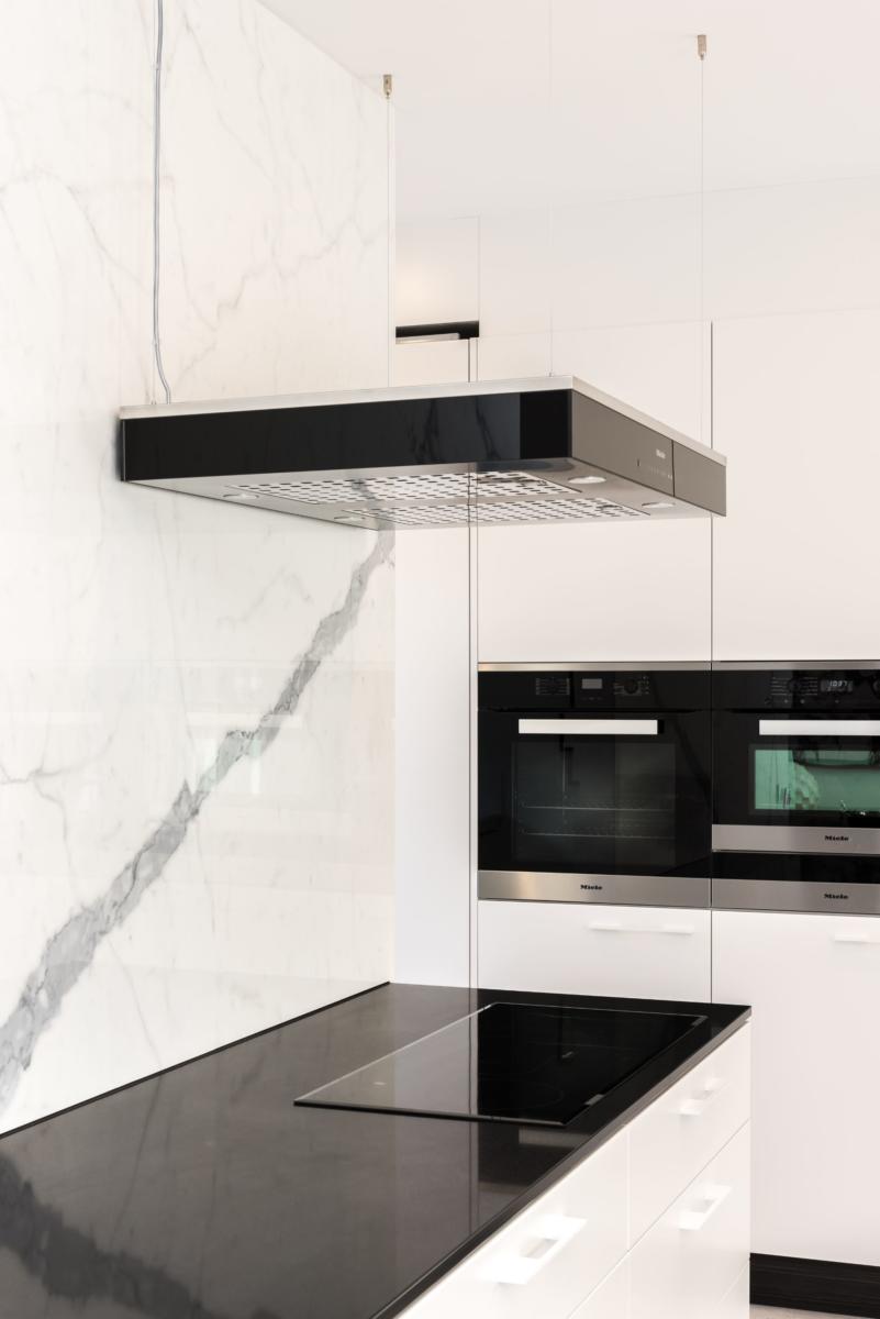 This stunning entertainer’s kitchen oozes style – the monochrome colour palette and marble and glass features perfectly complement the stone benchtop in jet black and two-pack satin finish. Designed with functionality in mind.